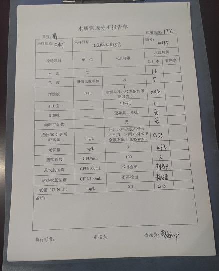 2021年4月15日汨罗市自来水公司水质每日检测报告