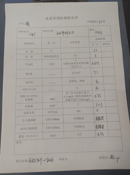 2021年4月23日汨罗市自来水公司水质每日检测报告