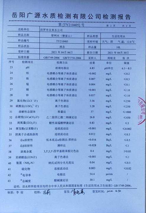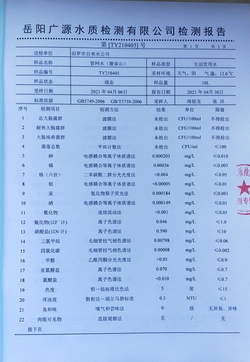 2021年4月份汨罗市自来水公司管网水(燎家山)水质检测月报表