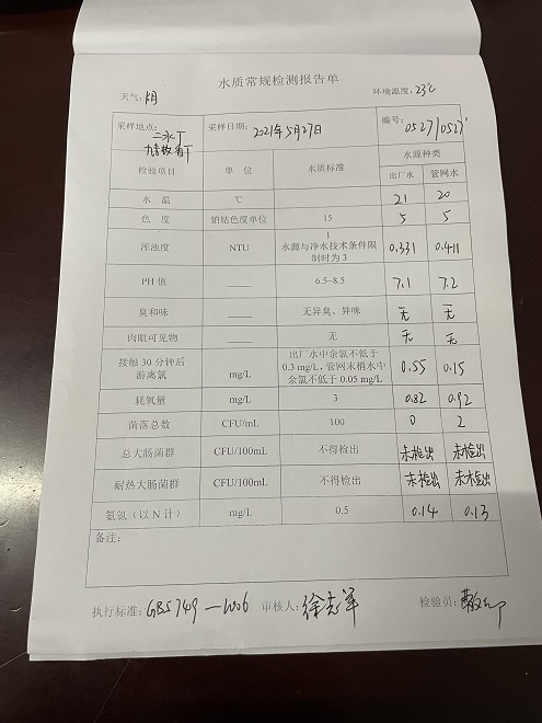 2021年5月27日汨罗市自来水公司水质每日检测报告