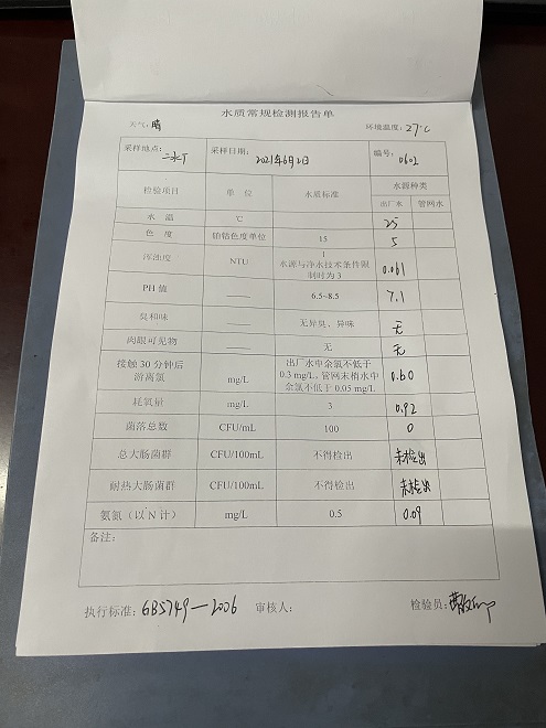 2021年6月2日汨罗市自来水公司水质每日检测报告
