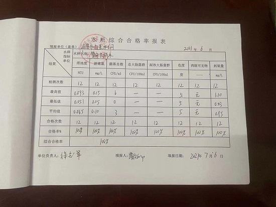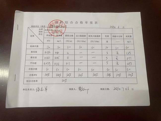 2021年6月份汨罗市自来水公司水质综合合格率报表