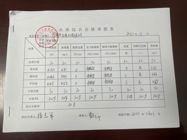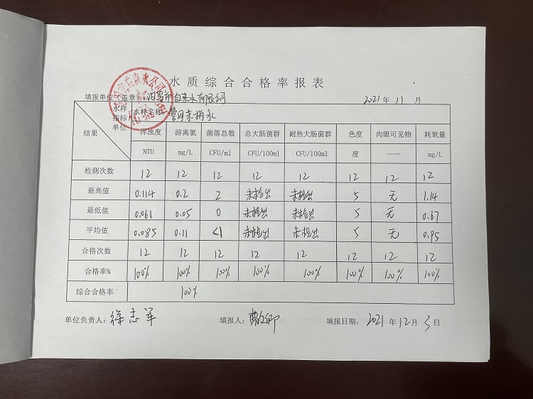 2021年11月份汨罗市自来水公司水质综合合格率报表