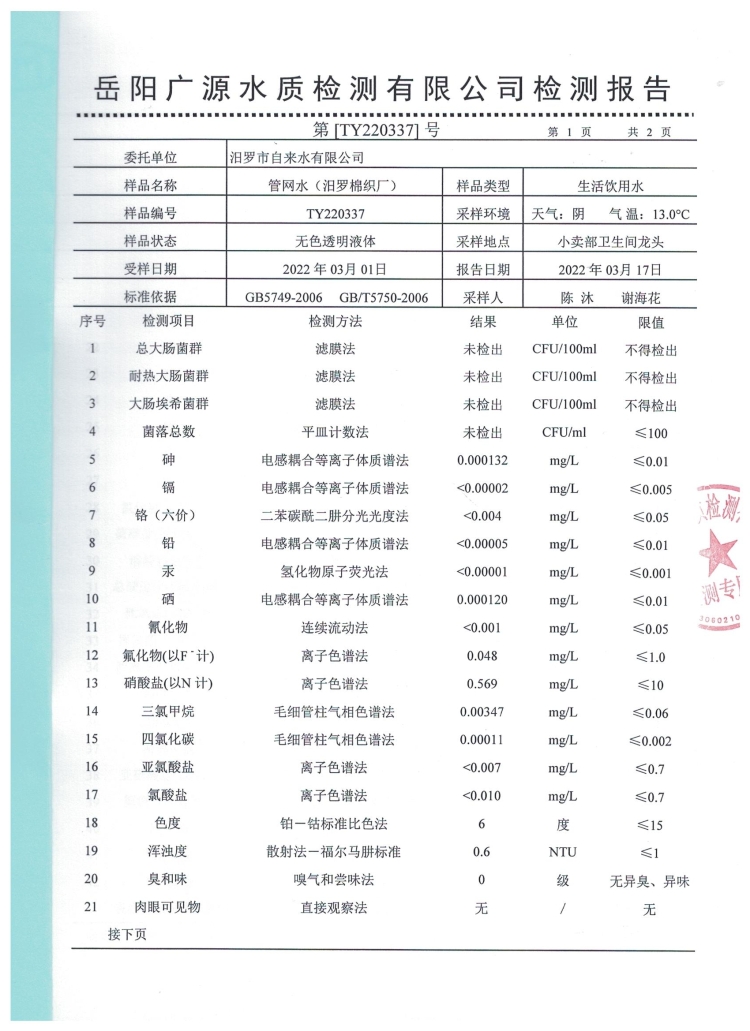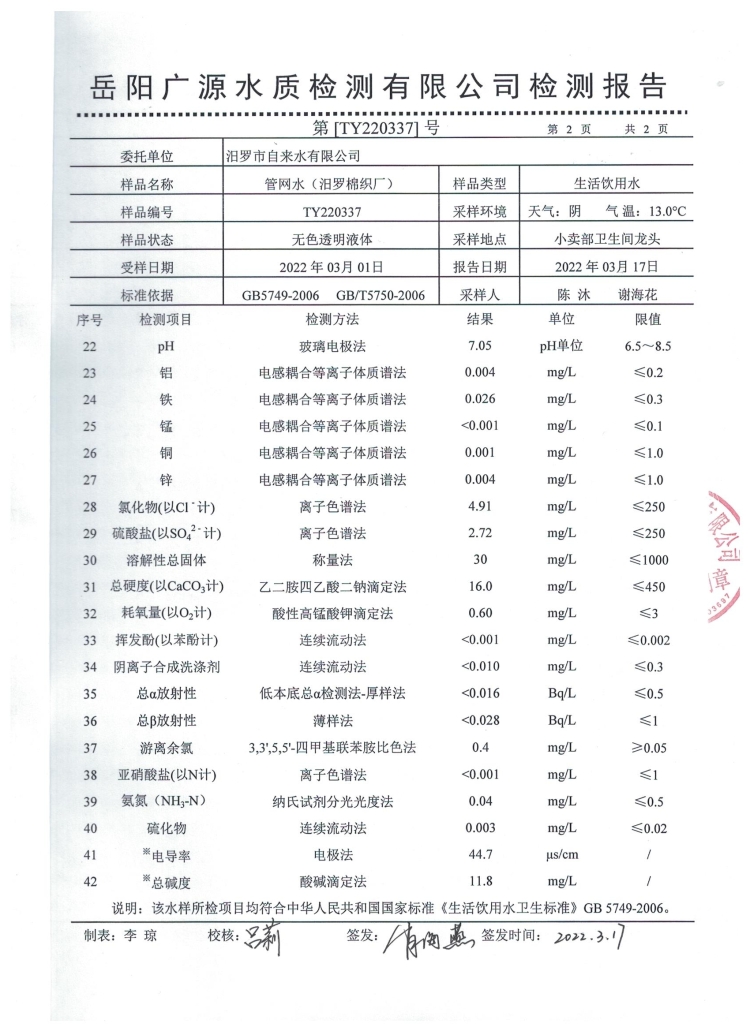 2022年3月份汨罗市自来水公司管网水(棉织厂)水质检测月报表