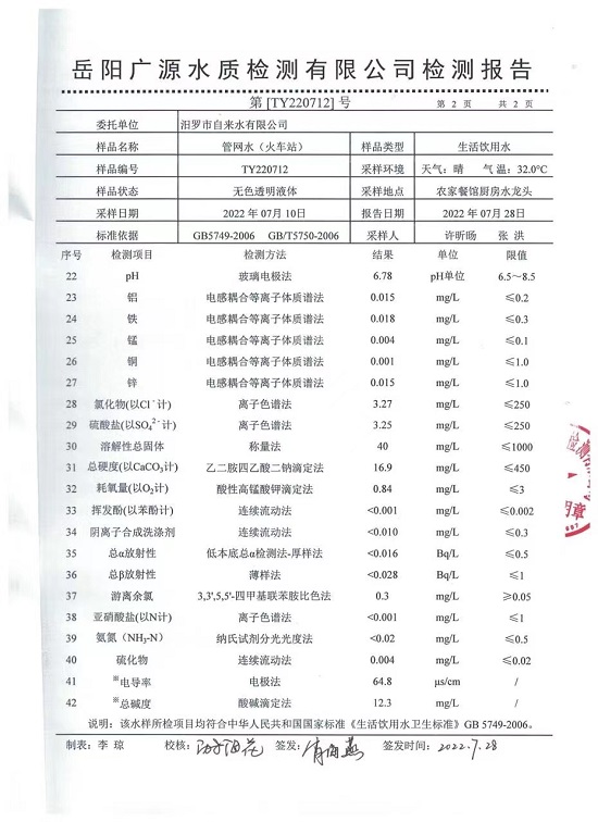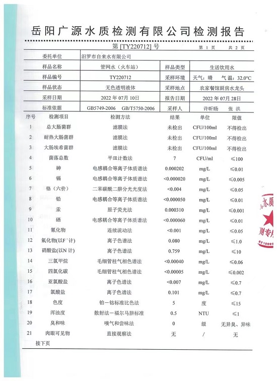 2022年7月份汨罗市自来水公司管网水(火车站)水质检测月报表