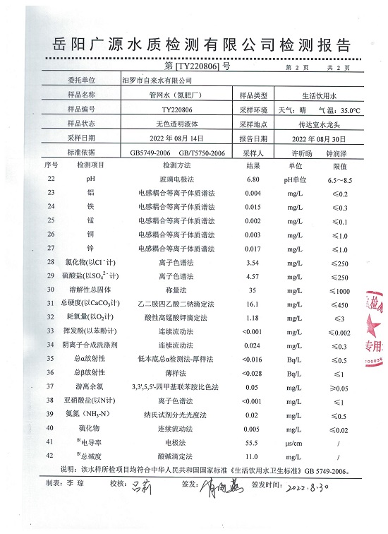 2022年8月份汨罗市自来水公司管网水(氮肥厂)水质检测月报表