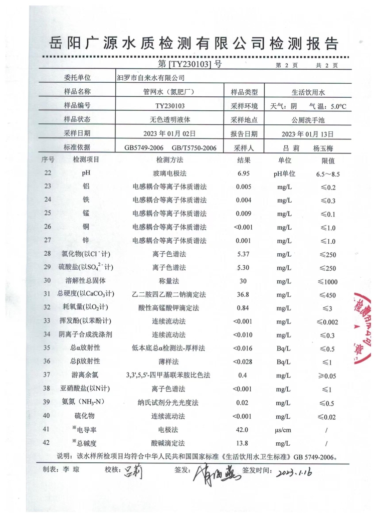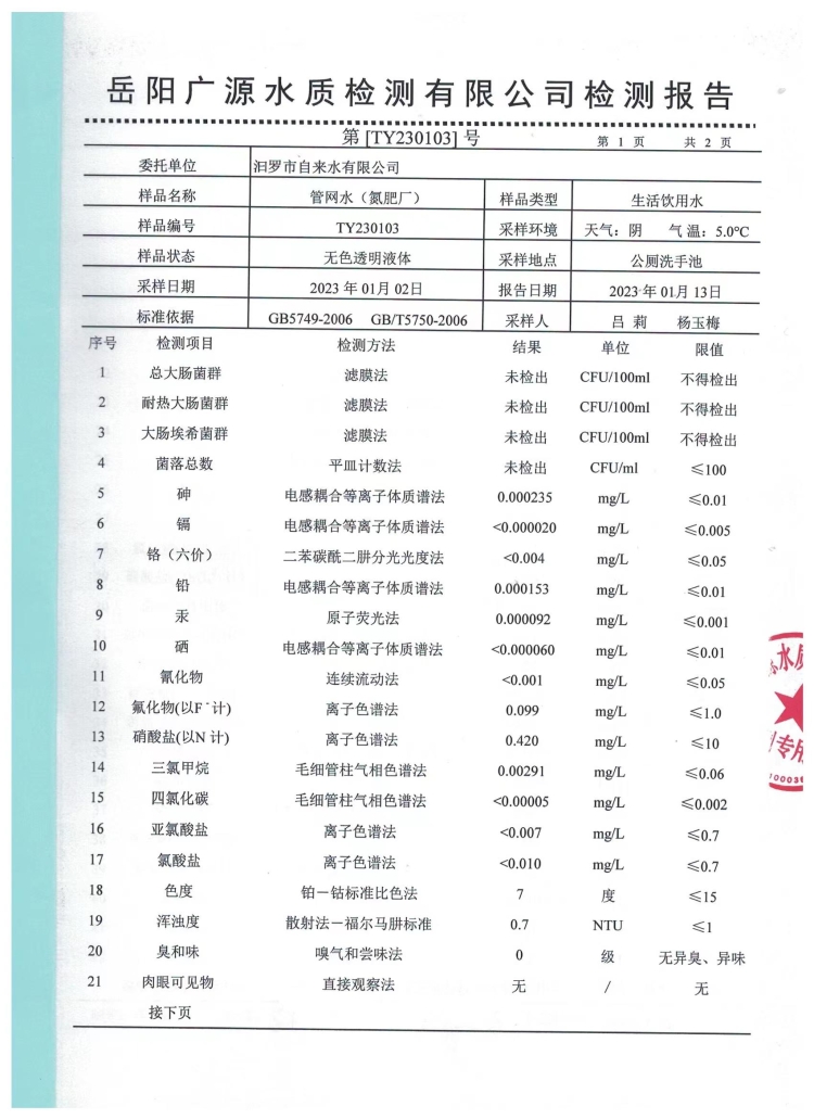 2023年1月份汨罗市自来水有限公司管网水(氮肥厂)水质检测月报表