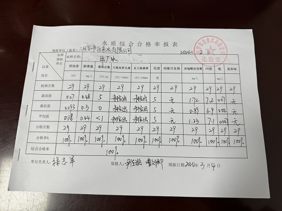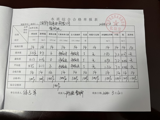 2024年2月份汨罗市自来水公司水质综合合格率报表