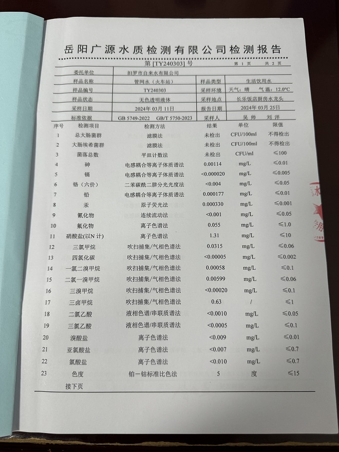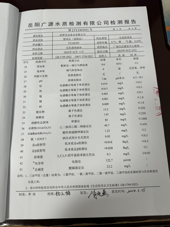 2024年3月份汨罗市自来水有限公司管网水(火车站&高铁站)质检月报表 (图) (图)