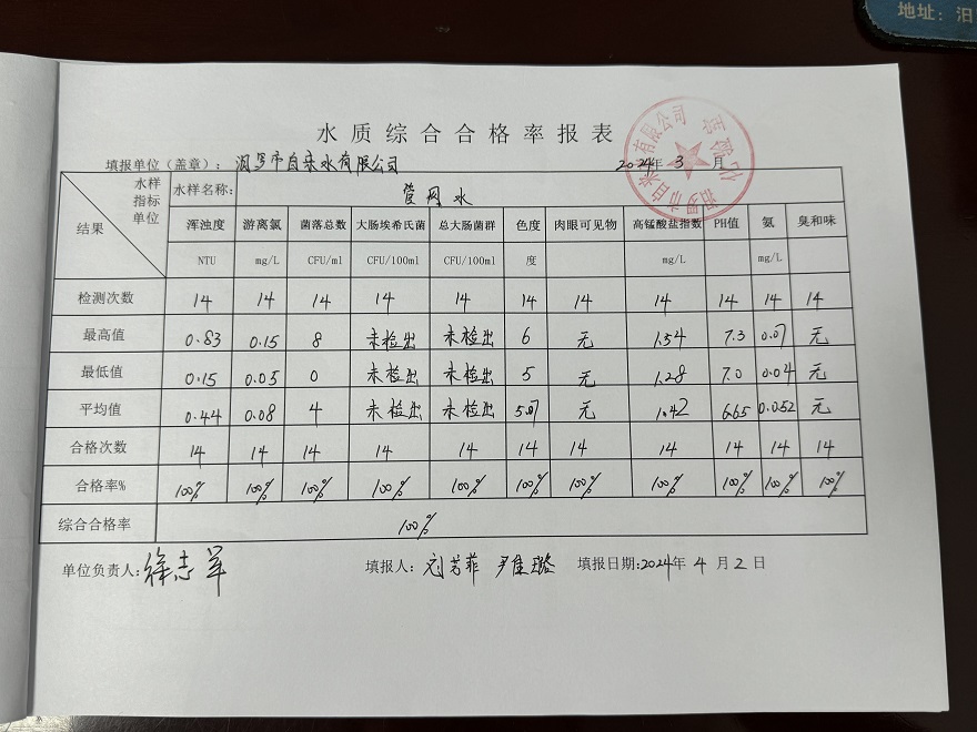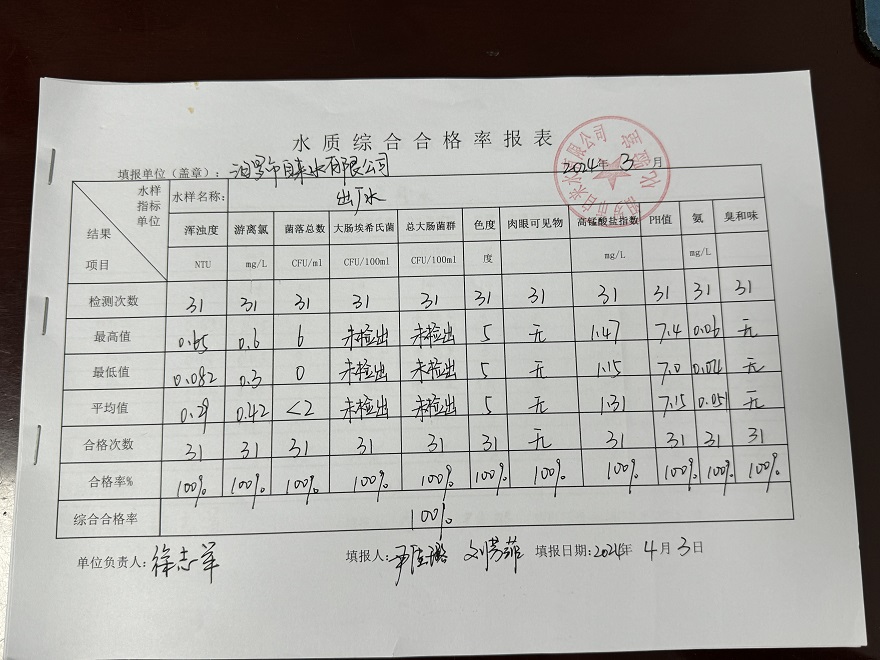 2024年3月份汨罗市自来水公司水质综合合格率报表 (图)