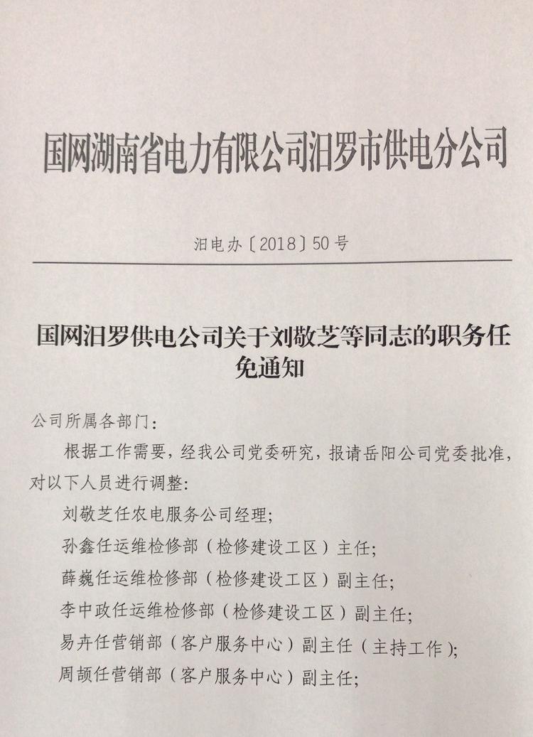 关于汨罗供电公司人员任免通知