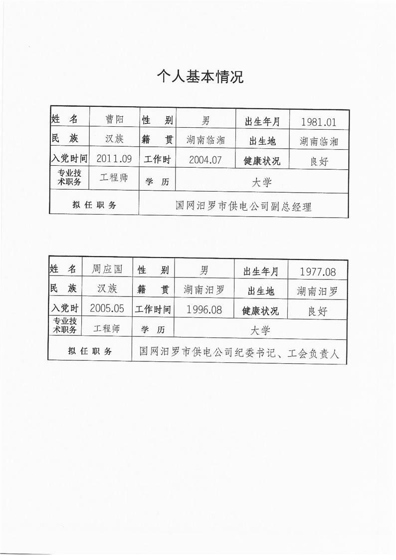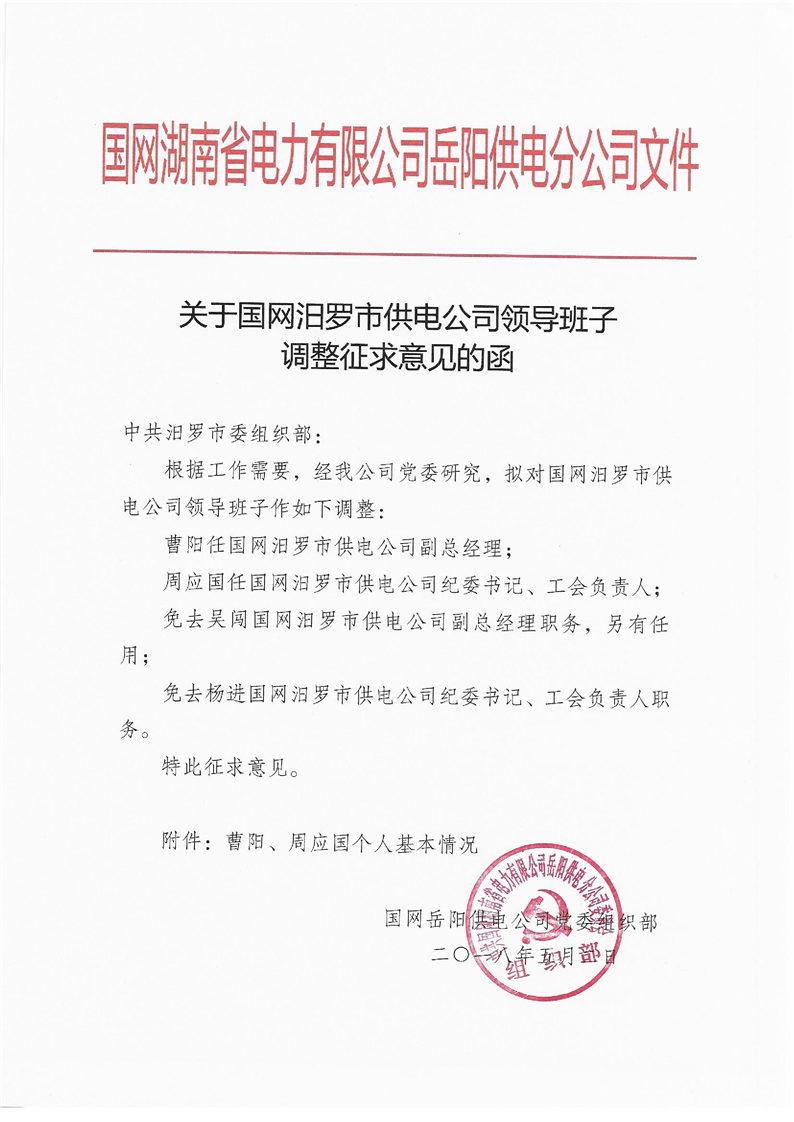 关于国网汨罗市供电公司领导班子调整征求意见的函