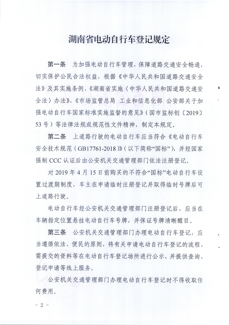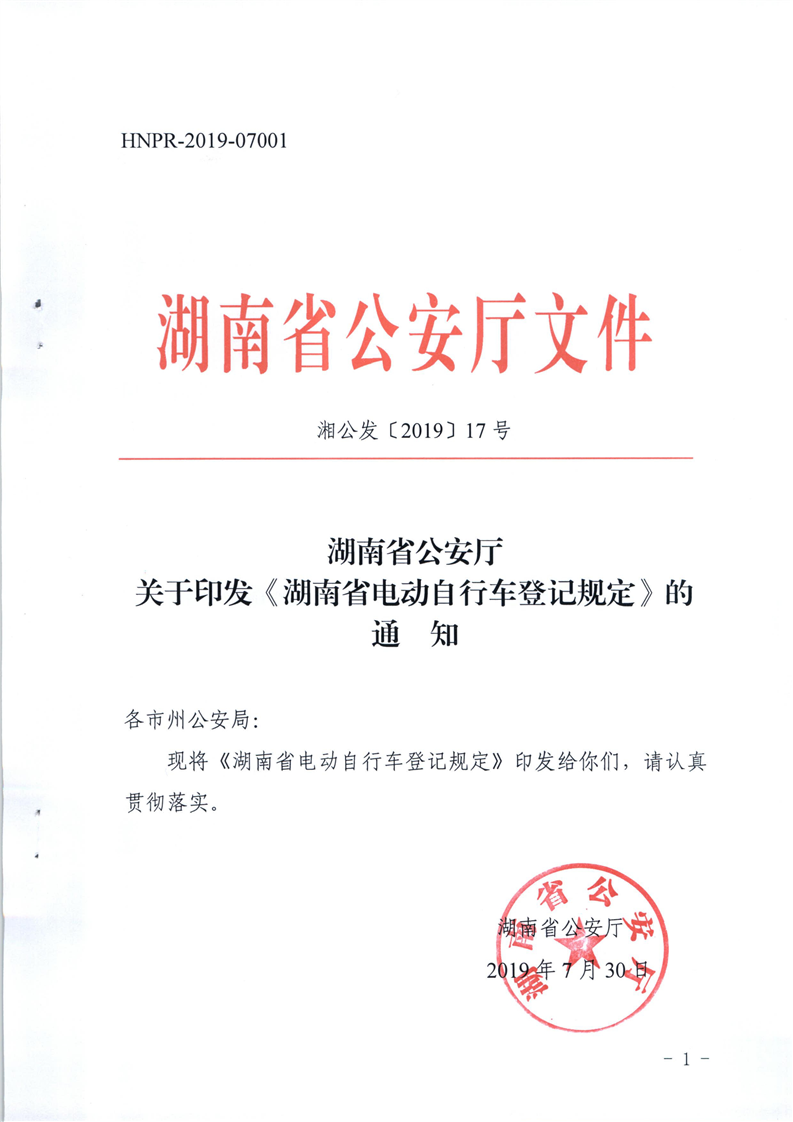 湖南省公安厅关于印发《湖南省电动自行车登记规定》的通知