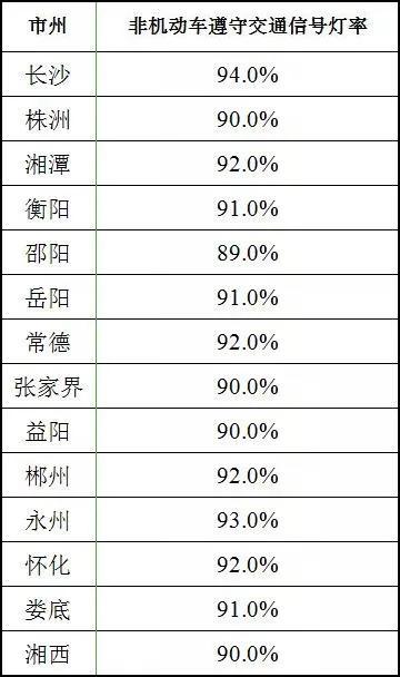 全省各地非机动车遵守交通信号灯率平均值为 91.2%,其中长沙、永州、湘潭、常德、郴州、怀化的遵守率较高,分别为 94.0%、93.0%、92.0%、92.0%、92.0%、92.0%。