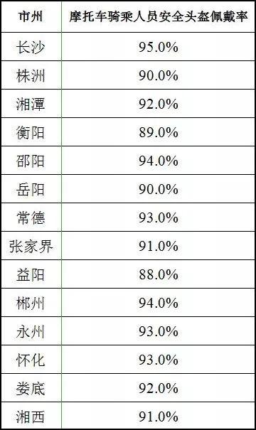 全省各地摩托车骑乘人员安全头盔佩戴率平均值为 91.8%,其中长沙、邵阳、郴州的佩戴率较高,分别为 95.0%、94.0%、94.0%。