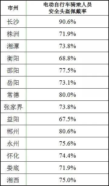 全省各地电动自行车骑乘人员安全头盔佩戴率平均值为 75.3%,其中长沙、郴州、常德的佩戴率较高,分别为 90.6%、80.6%、80.0%。