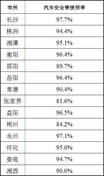 全省各地汽车安全带驾驶人使用率平均值为 92.8%,其中长沙、永州、益阳的使用率较高,分别为 97.7%、97.1%、96.5%。
