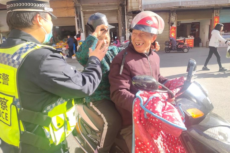 “嗲嗲,您骑摩托车要戴头盔嘞。”12月1日,长乐集镇上,交警拦下一位骑着摩托车的老人说道。老人家连忙边打开后备箱,边说:“带了带了,在这呢。”“头盔是要保护您的,您得戴头上才能被保护呀!”交警边说边帮老人将头盔正确佩戴好。