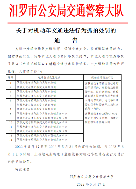 新增监控,汨罗两路口启动交通违法行为抓拍