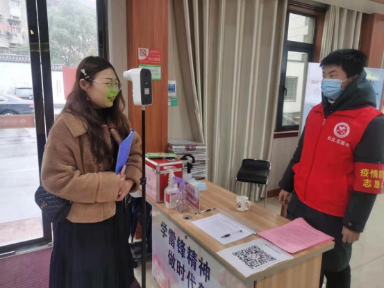 (通讯员:陈姿琳)1月27日中午午饭后,友谊河社区的大学生志愿者欧好轩早早来到社区,下午社区的体温检测岗下午他负责,下雨天为了不迟到,他中午决定不休息了就从家里出发了。欧好轩是汨罗市第三职业中专学校19级计算机班的学生,他笑着说,自己1月20号放假以后就在家里拼命写作业,写完就有空做志愿者了。
