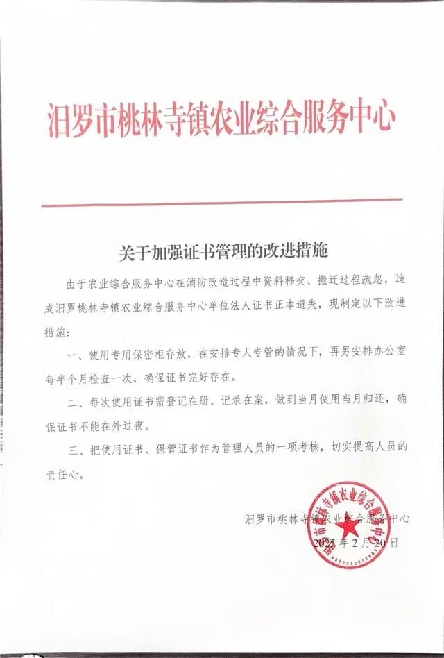 汨罗市桃林寺镇农业综合服务中心关于加强证书管理的改进措施