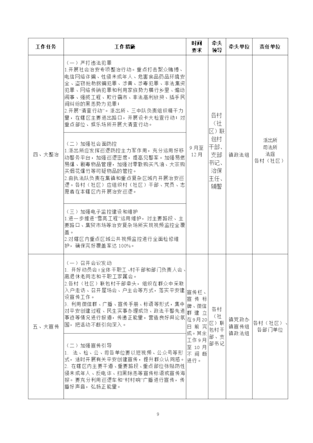 (1)严打违法犯罪。一是开展社会治安专项整治行动。重点打击聚众赌博、电信网络诈骗、性侵未成年人、危害食品药品环境安全、盗窃抢劫拐骗犯罪、涉黄、涉毒犯罪、非法集资犯罪、网络传销犯罪和利用家族势力横行乡里、煽动闹事、强揽工程、欺行霸市、非法高利放贷、插手民间纠纷的黑恶势力犯罪;二是开展“清查行动”。派出所、三中队负责组织精干力量,在辖区主要进出路口,开展设卡大检查行动;对重点部位、娱乐场所开展大清查行动。