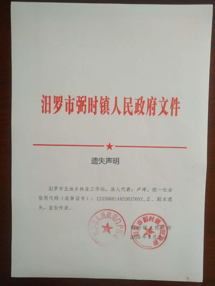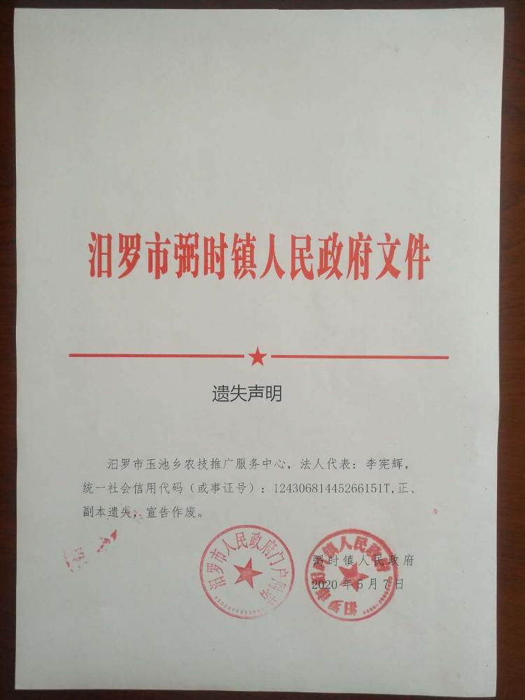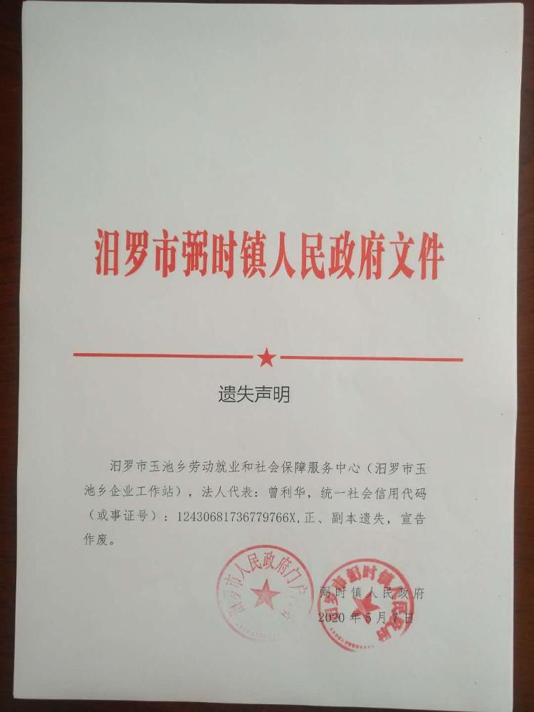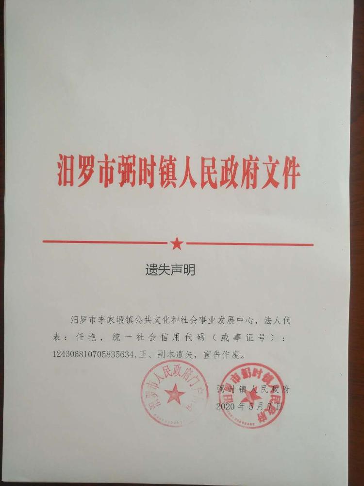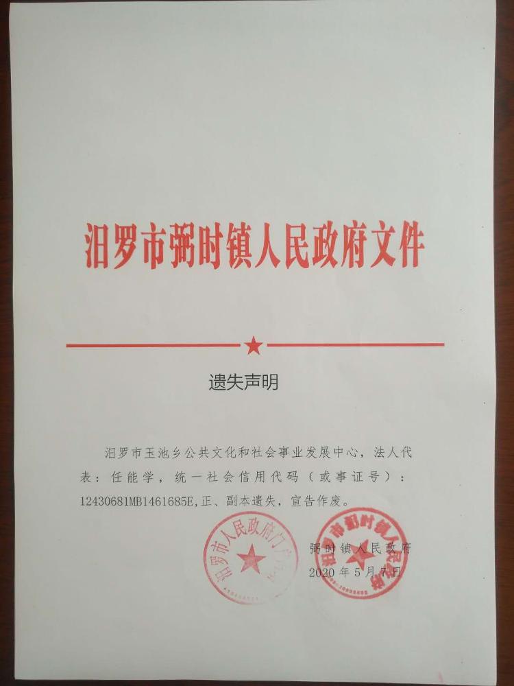 关于汨罗市原李家塅镇、玉池乡事业单位法人证书遗失声明