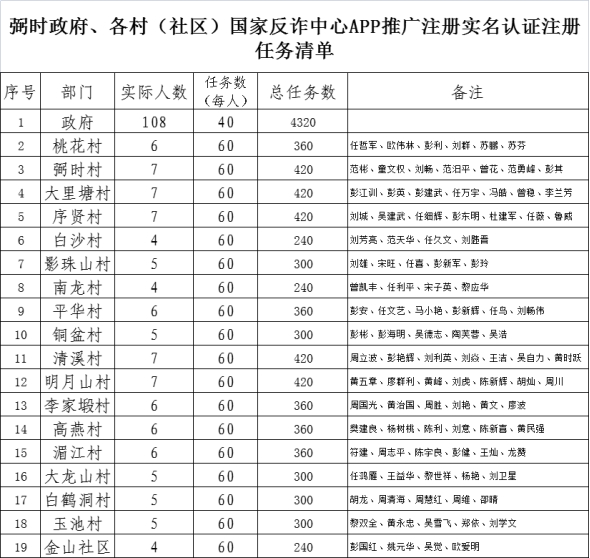 各干职工、各村(社区)推广国家反诈中心APP实名注册任务清单