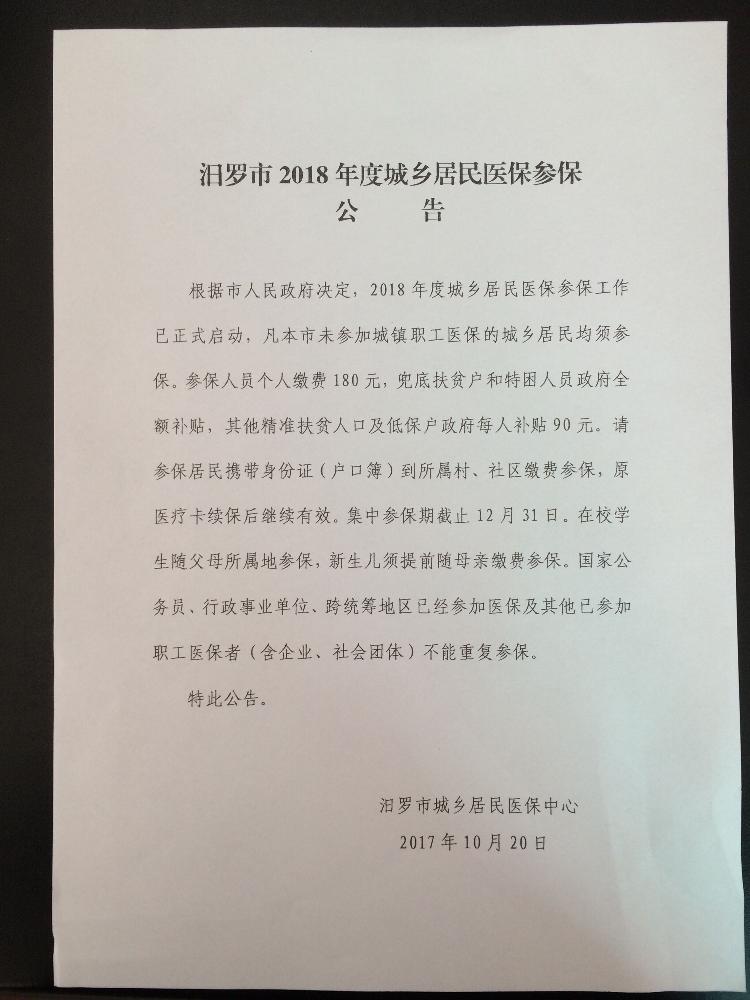 根据市人民政府决定,2018年度城乡居民医保参保工作已正式启动,凡本市未参加城镇职工医保的城乡居民均须参保。参保人员个人缴费180元,兜底扶贫户和特困人员政府全额补贴,其他精准扶贫人口及低保户政府每人补贴90元。请参保居民携带身份证(户口簿)到所属村、社区缴费参保,原医疗卡续保后继续有效。集中参保期截止12月31日。在校学生随父母所属地参保,新生儿须提前随母亲缴费参保。国家公务员、行政事业单位、跨统筹地区已经参加医保及其他已参加职工医保者(含企业、社会团体)不能重复参保。