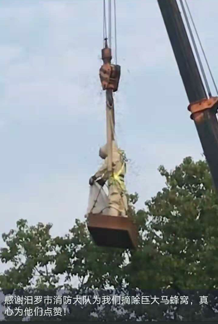 10月23日,汨罗市消防大队接警后,赶到汨罗镇,将一巨大马蜂窝摘除,消除一大安全隐患,干部群众纷纷为他们点赞。