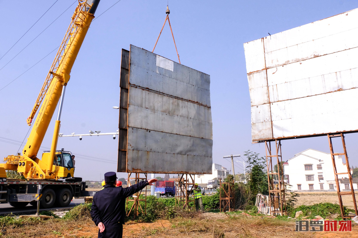 “一二三,用力拉。”11月27日上午,汨营线汨罗镇江景村段的一块巨型广告牌应声倒地。当天,市城管大队广告中队开展执法行动,对汨营线沿线的一块违规新建广告牌予以强制拆除。