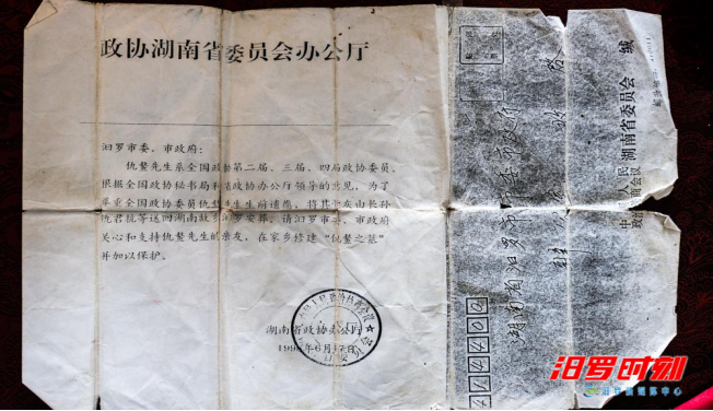 随仇鳌骨灰一起到古培镇雨坛村的,还有一份湖南省政协办公厅文件。文件中表示,仇鳌先生系全国政协第二届、三届、四届政协委员,根据全国政协秘书局和省政协办公厅领导的意见,为了尊重全国政协委员仇鳌先生生前遗嘱,将其骨灰由长孙仇君抗等送回湖南故乡汨罗安葬。请汨罗市委、市政府关心和支持仇鳌先生的亲友,在家乡修建“仇鳌之墓”并加以保护。