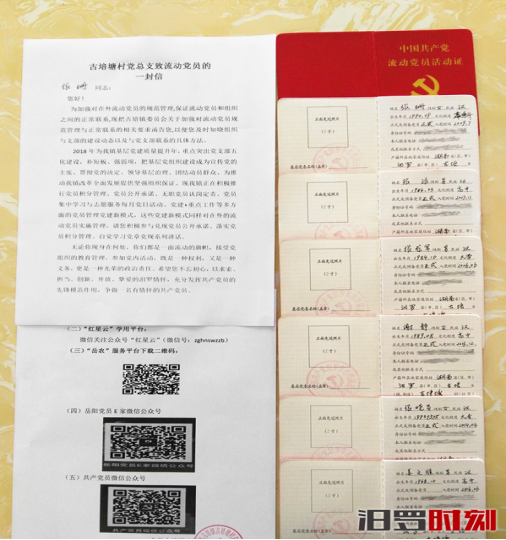 “《致流动党员的一封信》主要是为了解决流动党员去向难掌握、活动难开展、管理难到位、身份难明确的问题。”古培镇党建办组织干事易静介绍,今年是古培镇基层党建质量提升年,全镇正在积极推行党员积分管理、无职党员认岗定责、党建+重点工作等多方面的党员管理党建新模式,这些新模式同样应该对流动党员实施管理,不让一个人掉队。