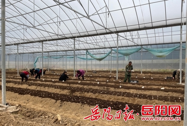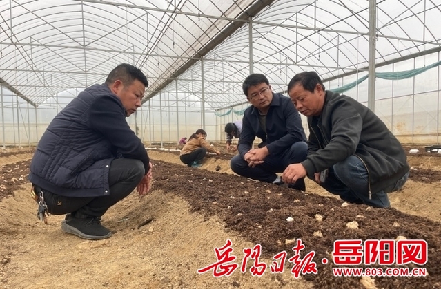 地头一侧大棚内,一排排栽培菌菇的畦床整齐排列。湖南省蔬菜产业技术体系食用菌岳阳试验站的技术人员周威正在现场指导:“盖草务必均匀,厚度控制在5厘米左右,这样才能有效保温保湿,为菌丝生长创造理想环境。”他特别叮嘱公司负责人熊岳飞,当前正值菌丝萌发的关键阶段,必须精准控制湿度、及时清理排水沟,严防积水影响菌丝发育。