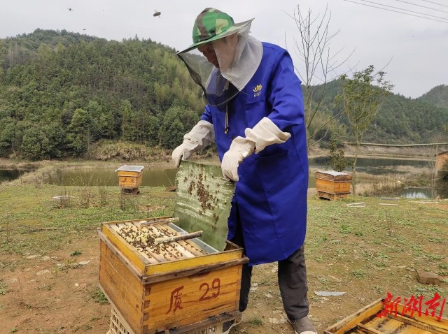 65岁的建档立卡贫困户何质彬正在进行蜜蜂分箱。他从蜂箱里取出蜂巢板,高兴地说:“疫情防控遇上蜜蜂转场和春繁关键期,政府积极协助蜂农采购饲料、蜂药、蜂机具等生产物资恢复生产。清明过后,就可割第一批蜂蜜,今年收入有望突破2万元。”