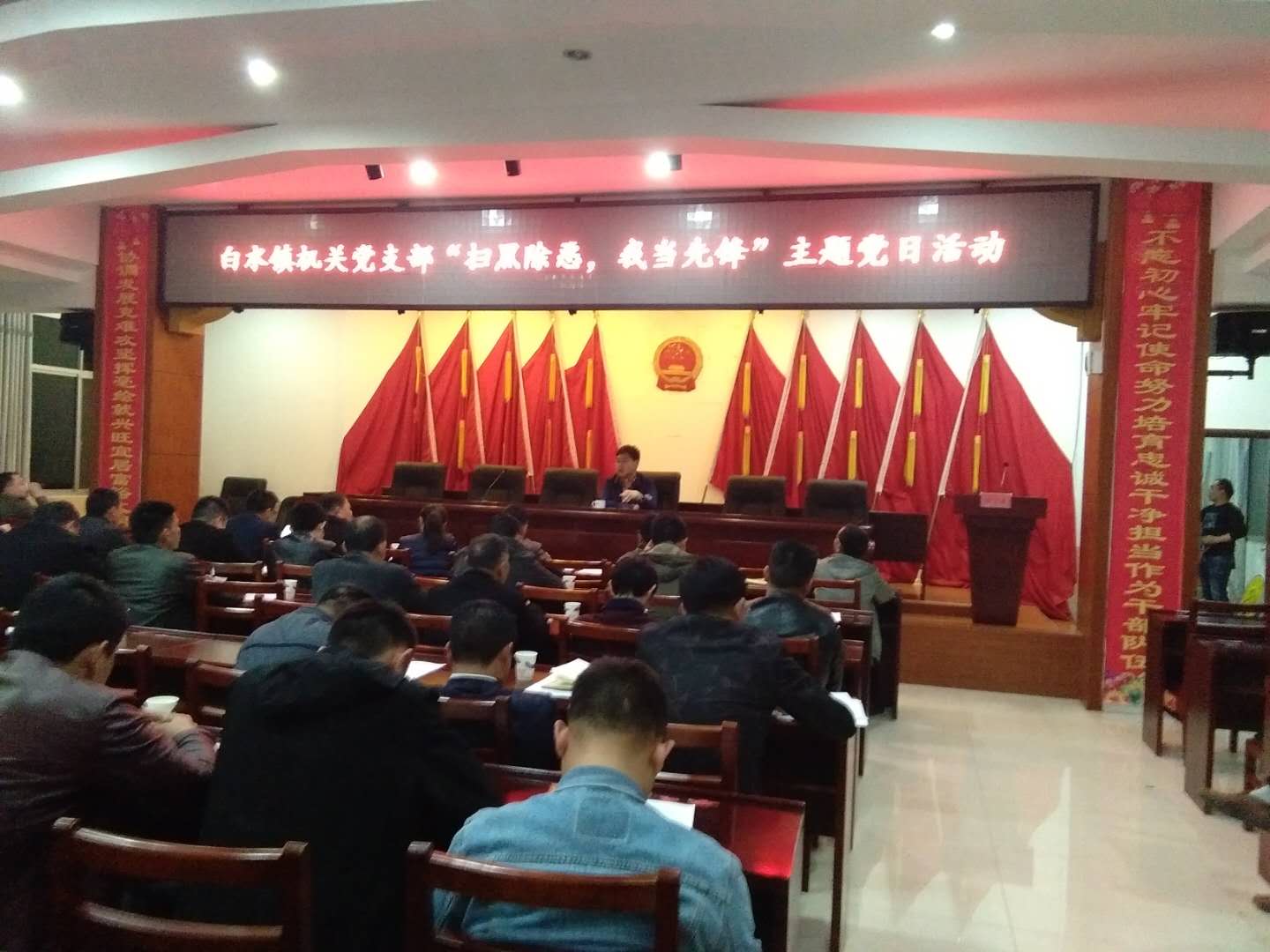 4月1日晚,白水镇机关党支部在政府4楼会议室开展“扫黑除恶,我当先锋”主题党日活动,全体机关党员、入党积极分子参会。会上,白水派出所所长黄律向参会人员作扫黑除恶政策解读,党委书记周振要求全体机关党员要提高政治站位,深入学习扫黑除恶专项行动工作相关精神。据了解,各村都将在近期就扫黑除恶专项斗争工作召开党员组长会。