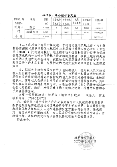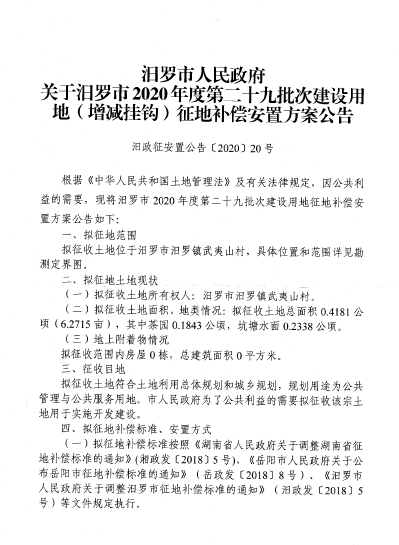 汨罗市2020年度第二十九批次建设用地征地补偿安置方案公告