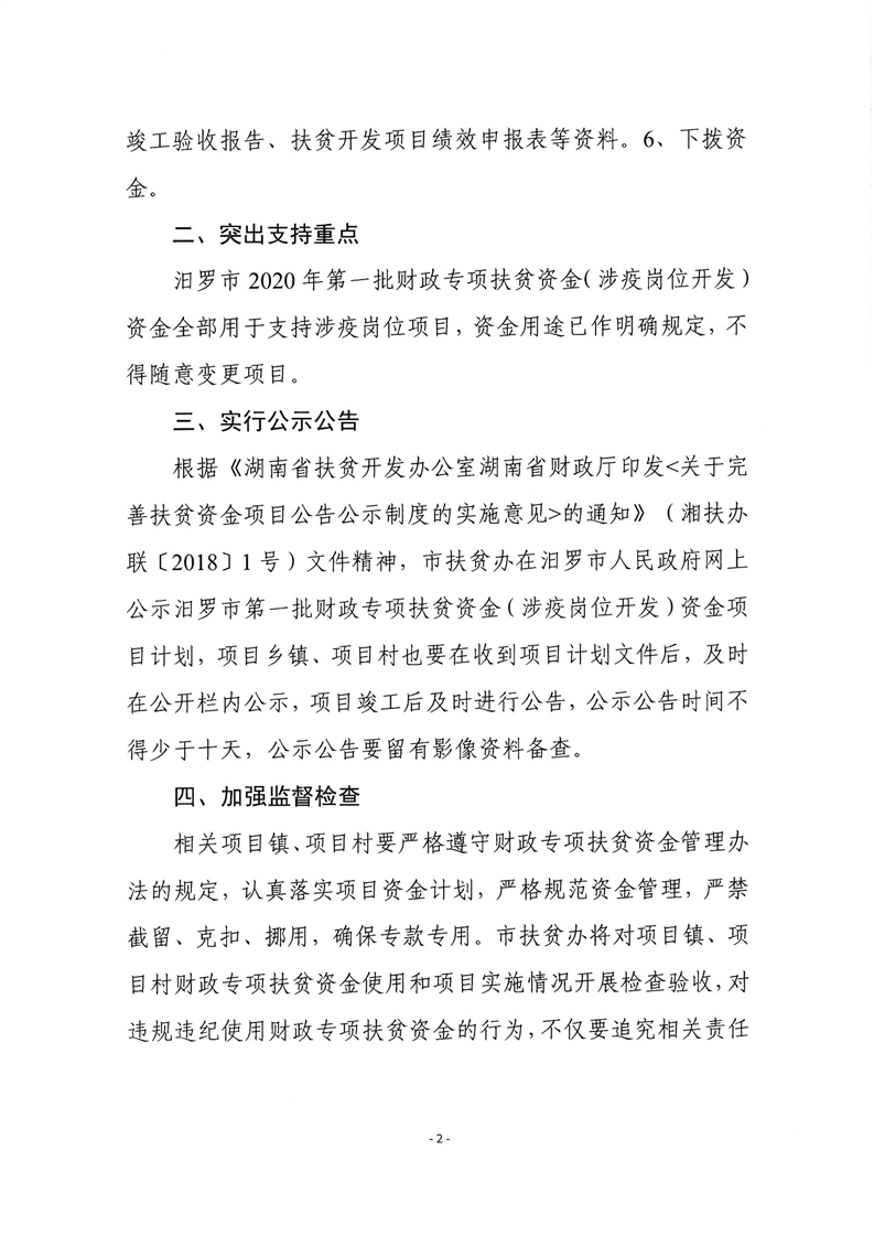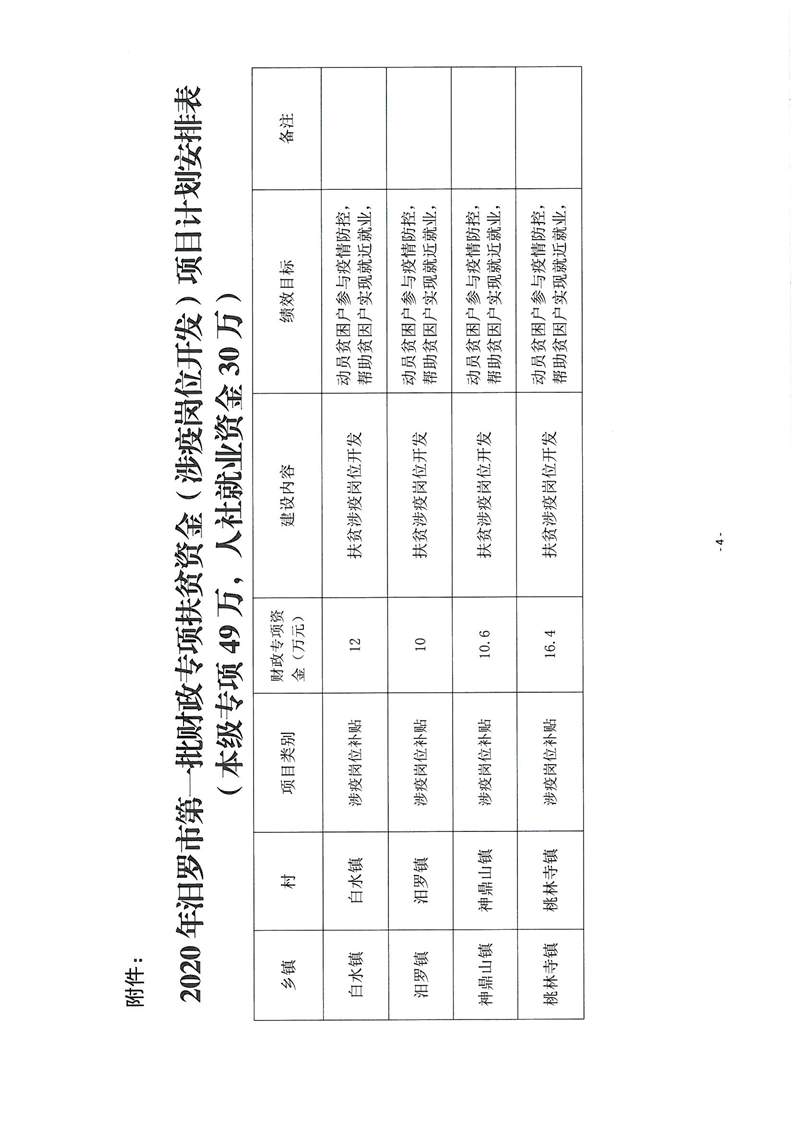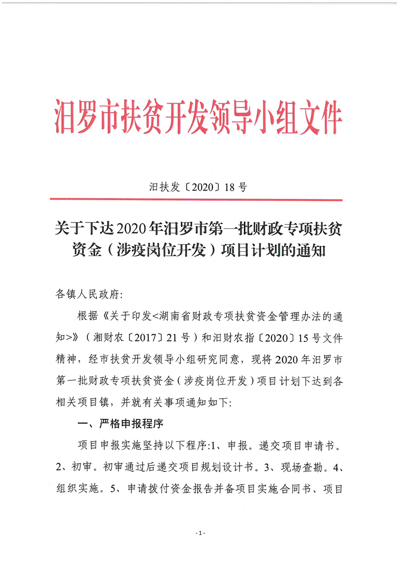 关于下达2020年汨罗市第一批财政专项扶贫资金(涉疫岗位开发)项目计划的通知