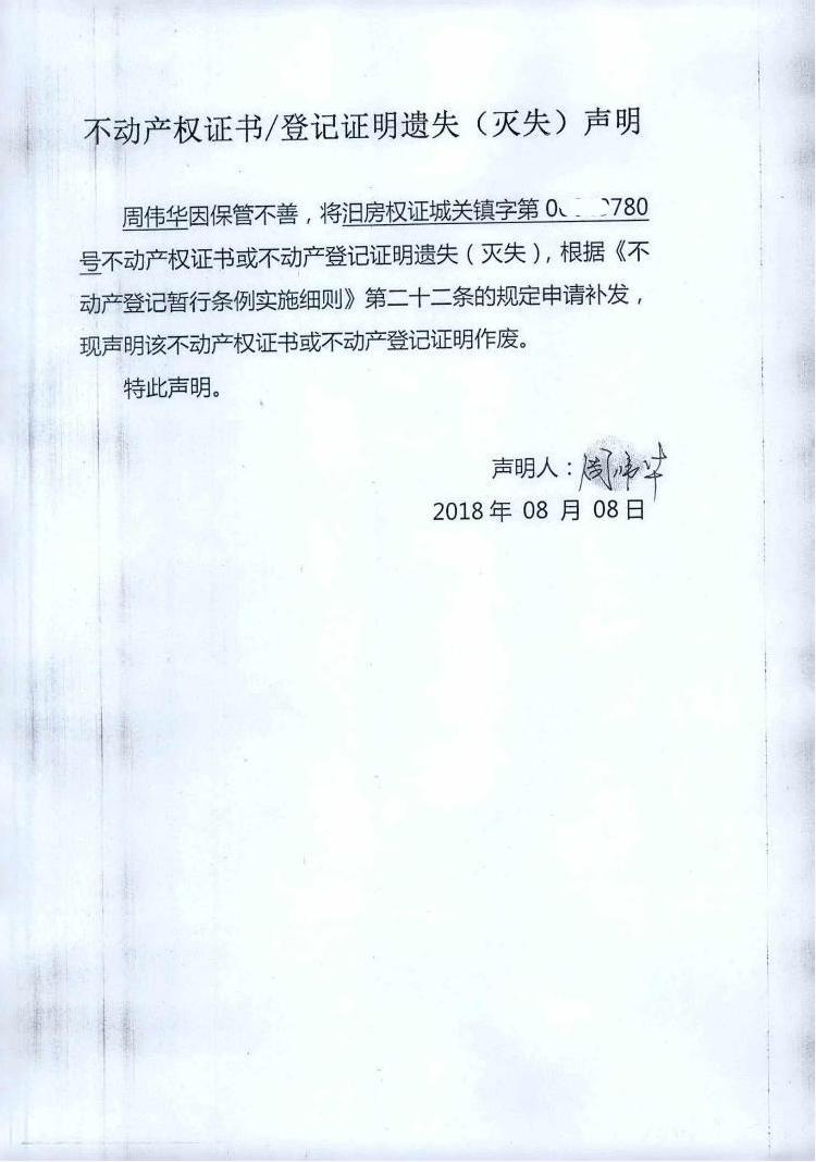 不动产权证书遗失声明(周伟华)
