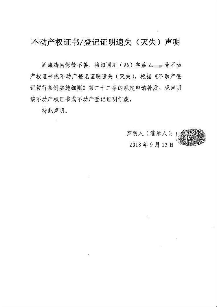 不动产权证书遗失声明(周海涛)