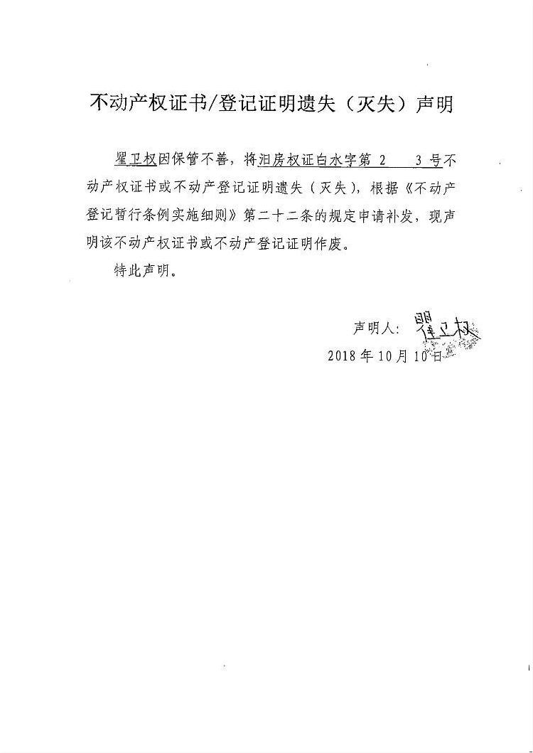 不动产权证书遗失声明(瞿卫权)