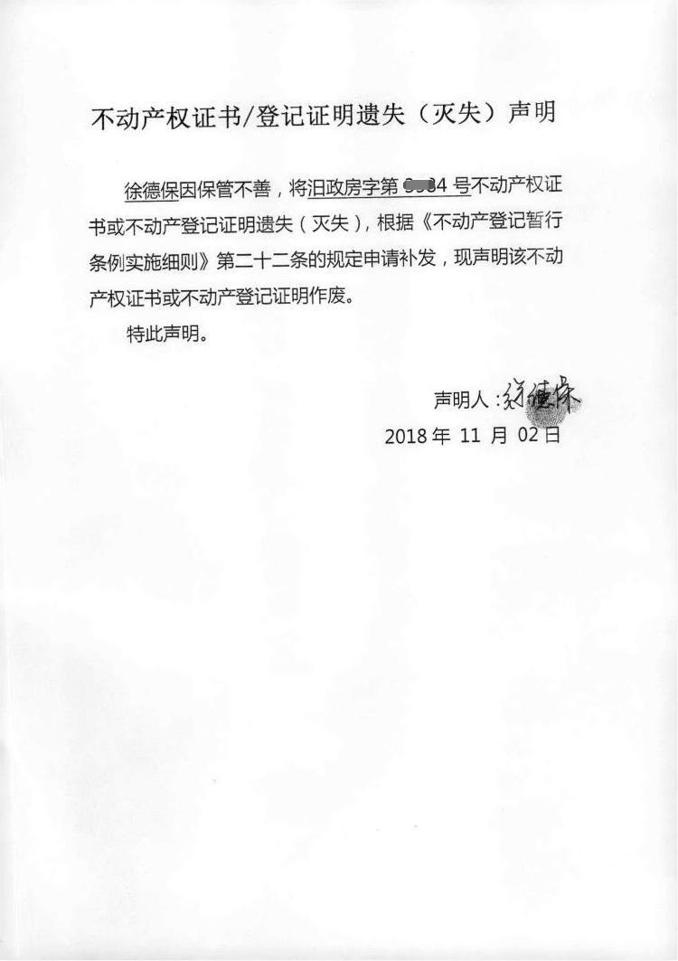不动产权证书遗失声明(徐德保)