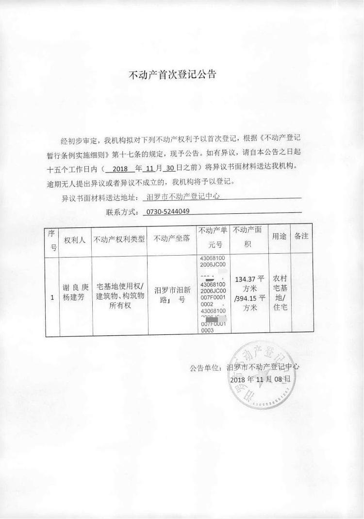 不动产首次登记公告(谢良庚)