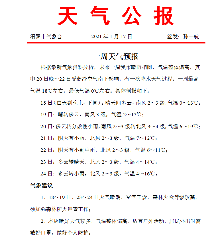 天气公报2021年1月17日