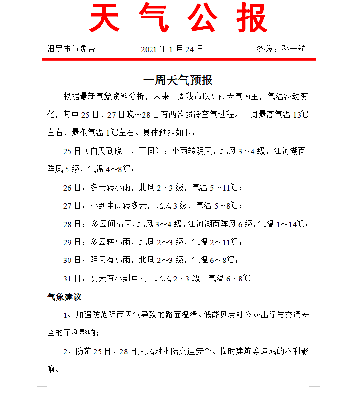 天气公报2021年1月24日