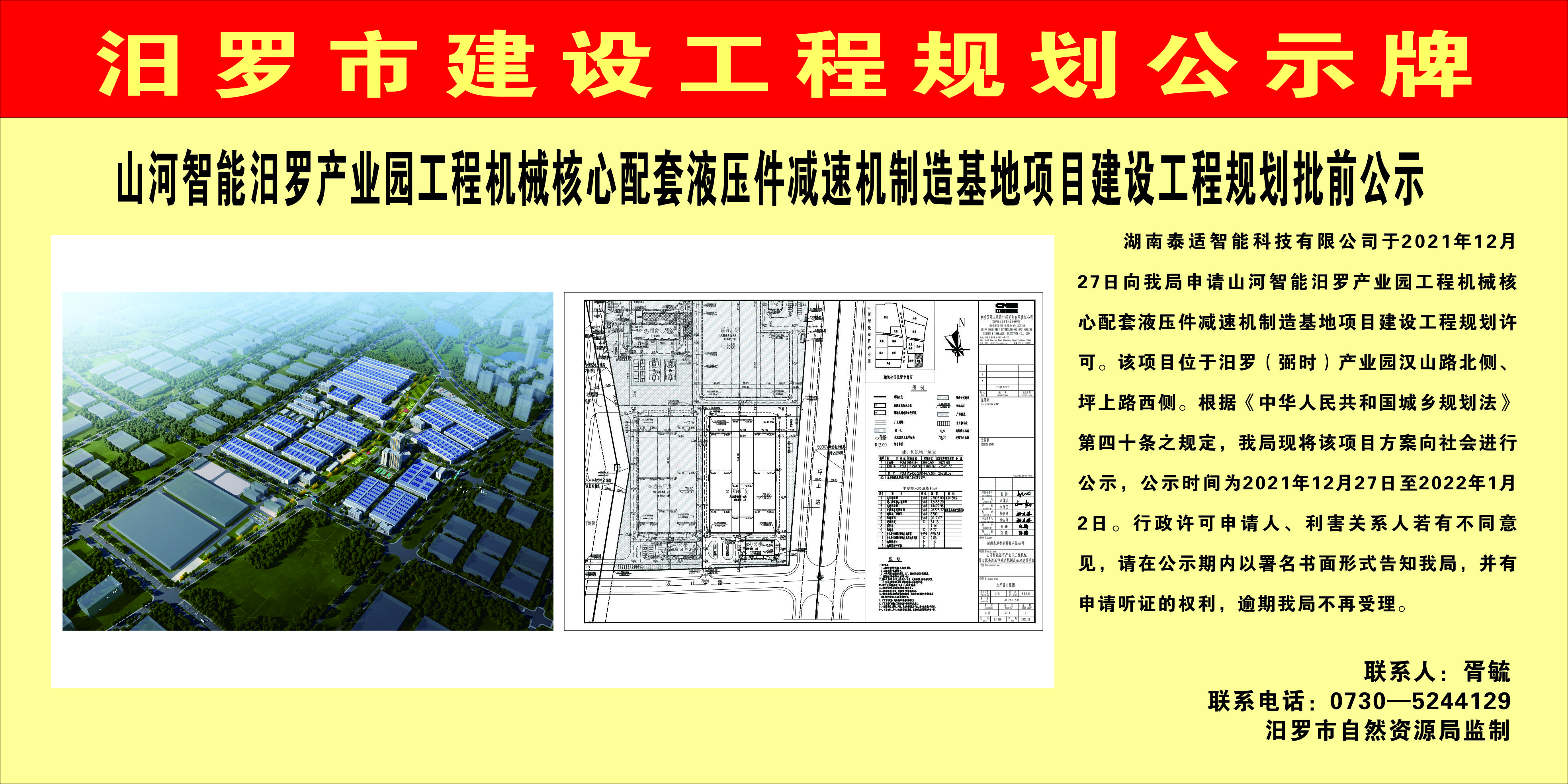 山河智能汨罗产业园工程机械核心配套液压件减速机制造基地项目建设工程规划批前公示