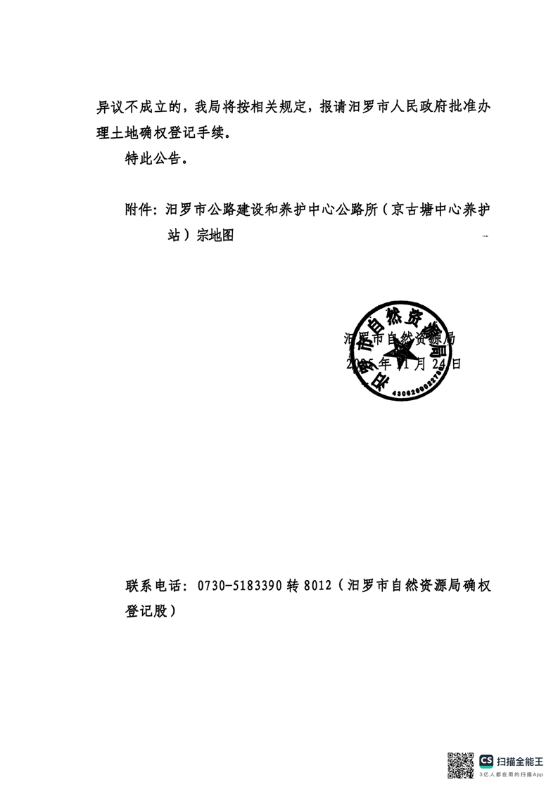 关于确定汨罗市公路建设和养护中心公路所(京古塘中心养护站)国有建设用地使用权的公告