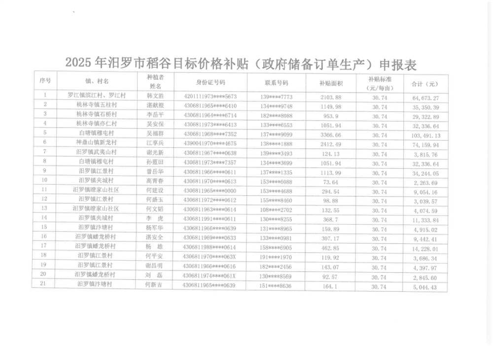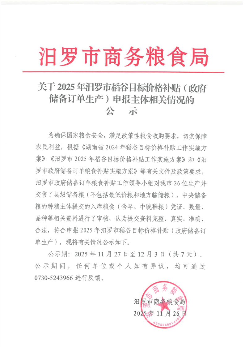 关于2025年汨罗市稻谷目标价格补贴(政府储备订单生产)申报主体相关情况的公示