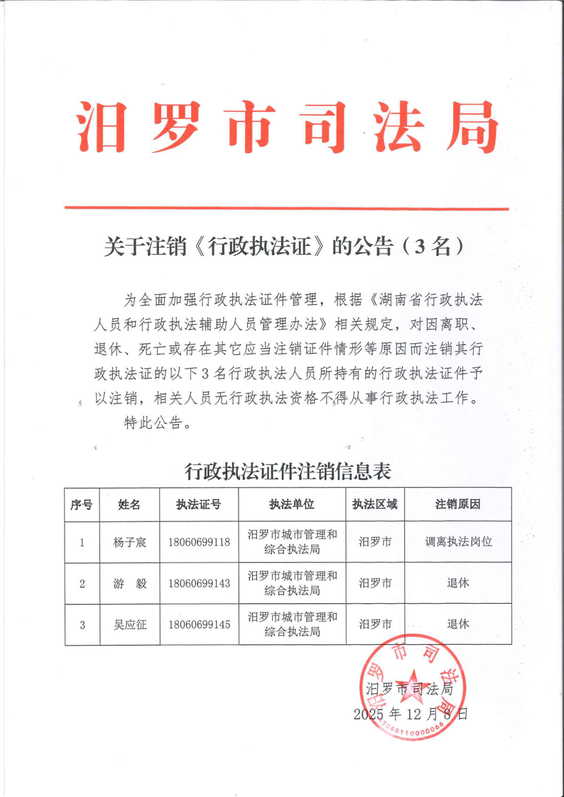关于注销《行政执法证》的公告(3名)