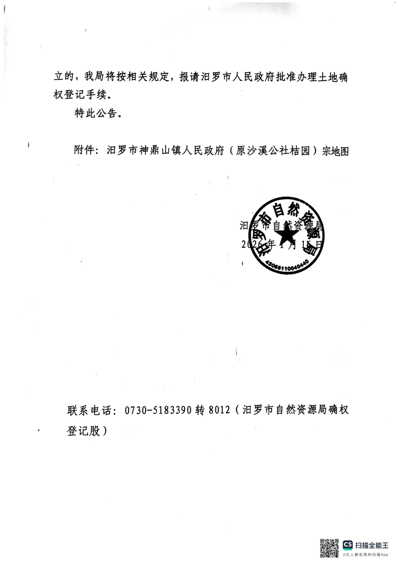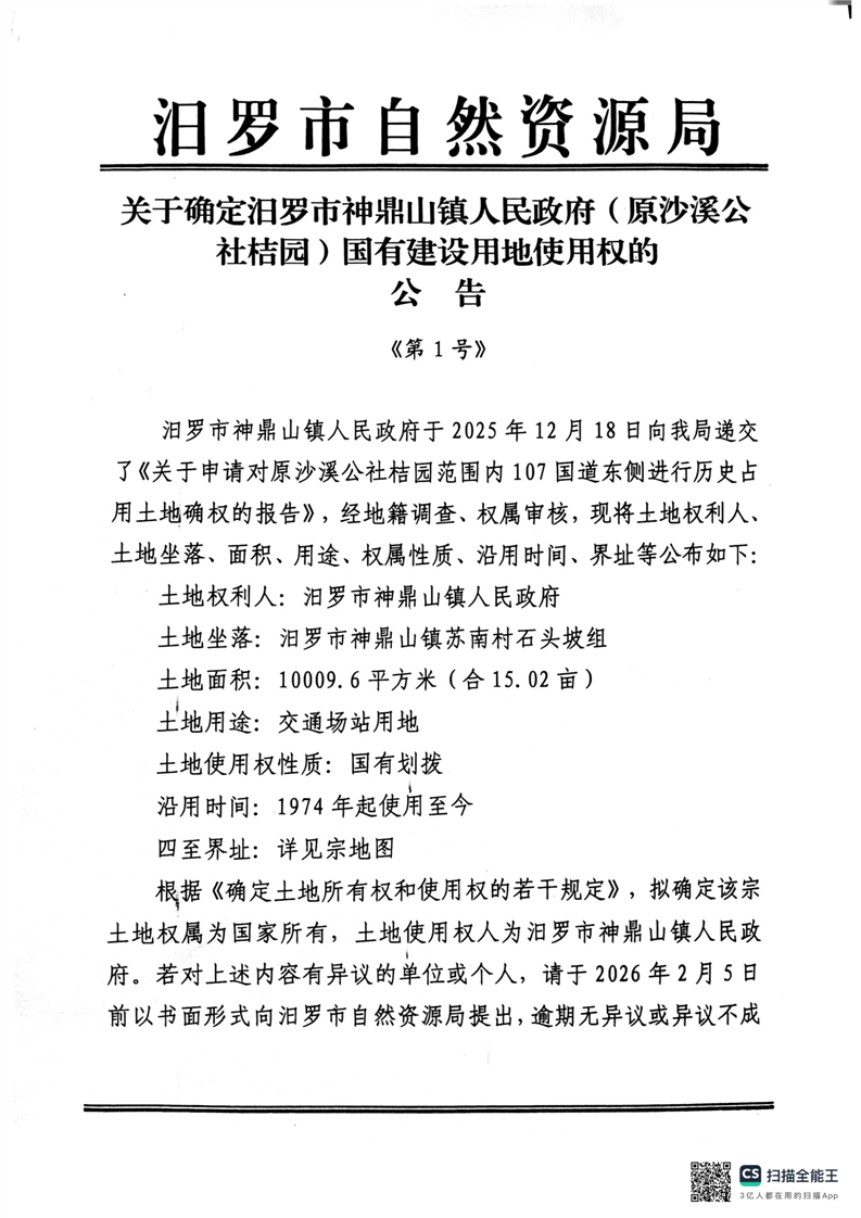 关于确定汨罗市神鼎山镇人民政府(原沙溪公社桔园)国有建设用地使用权的公告